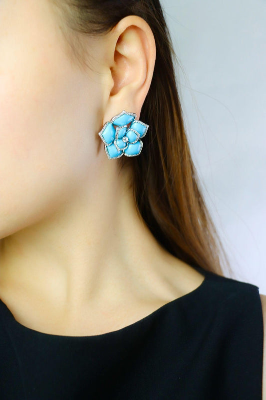 Diamond Turquoise 18K White Gold Flower Earrings