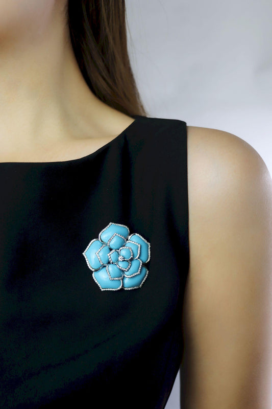 Diamond Turquoise 18K White Gold Flower Brooch