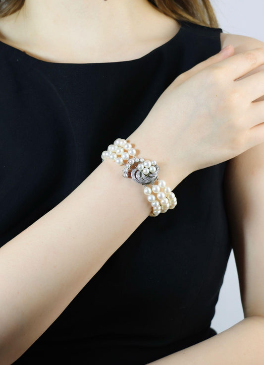 Vintage Platinum Diamonds Muti-Strand Pearl Waves Bracelet