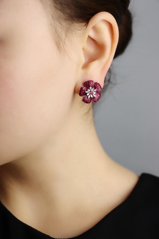 18K White Gold Diamond and Mystery Set Ruby Flower Earrings