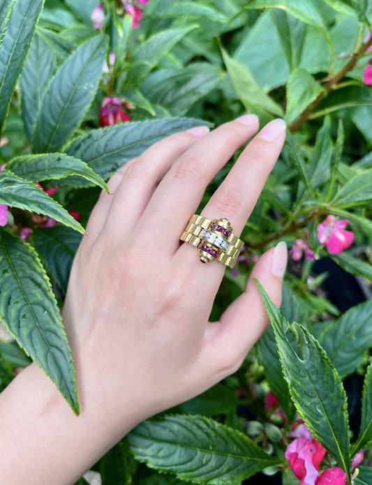 An Interesting Retro 18K Gold Diamond Ruby Ring Watch Strap Link Style