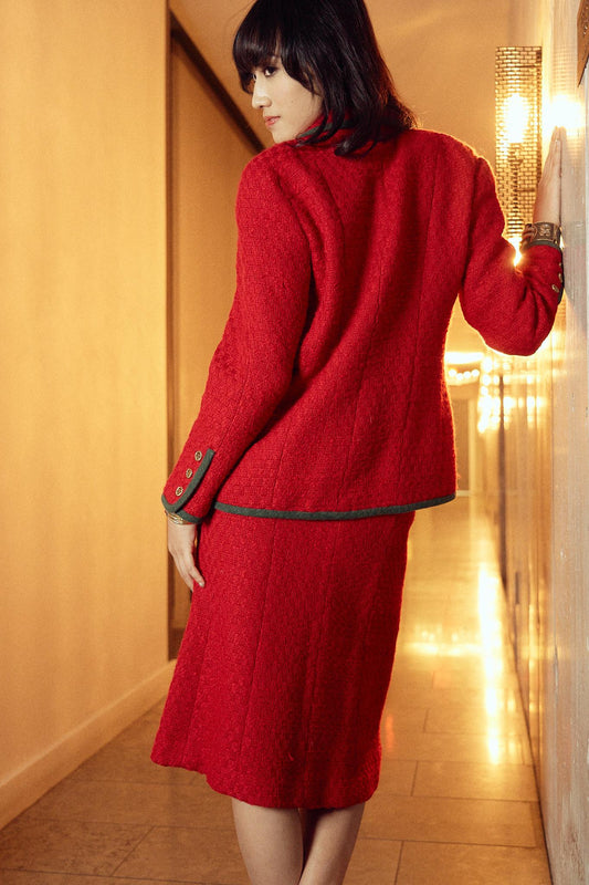 A Set of Vintage Chanel Boutique Red Tweed Green Trim Jacket & Skirt