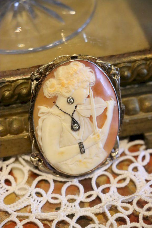 Antique 14K Gold Diamond Violinist Cameo Brooch