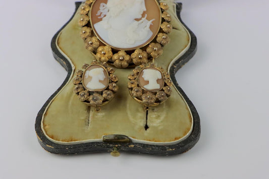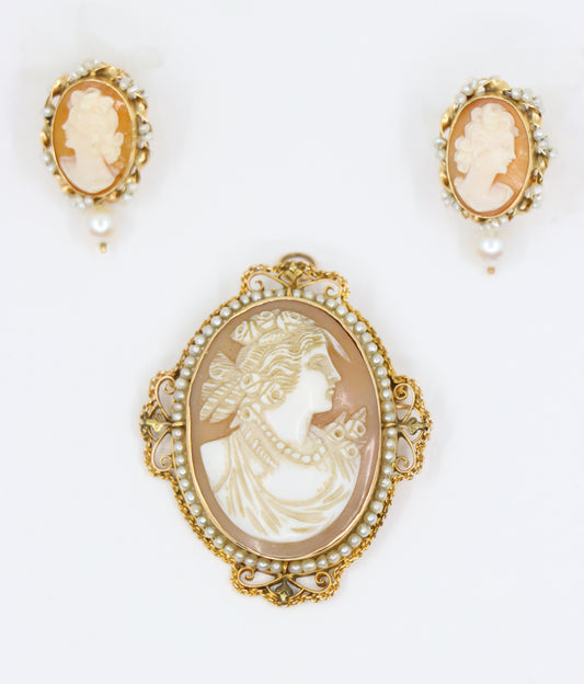 Antique 14K Gold Pearl Cameo Earrings & Brooch