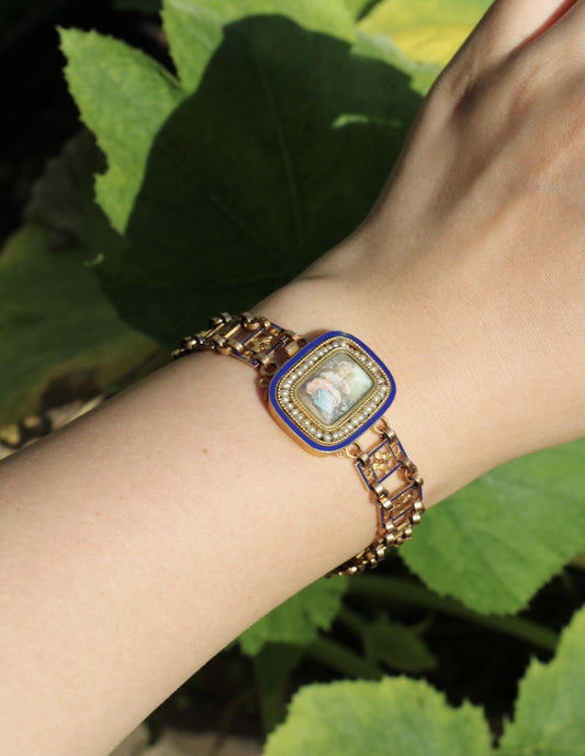Antique 18K Gold Hand Painted Portrait Enamel Pearl Bracelet