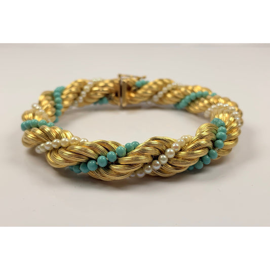 Stunning 18k Gold Turquoise & Pearl Bead Twist Bracelet