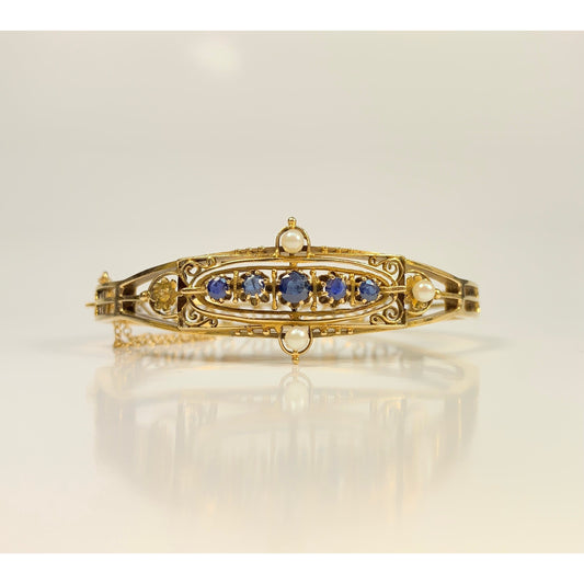 Vintage 14k Gold Sapphire & Pearl Cuff Bracelet