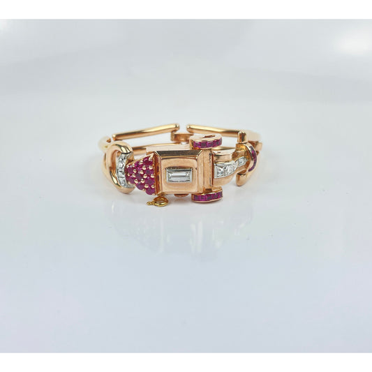 Retro 14k Gold Ruby Diamond Watch Bracelet