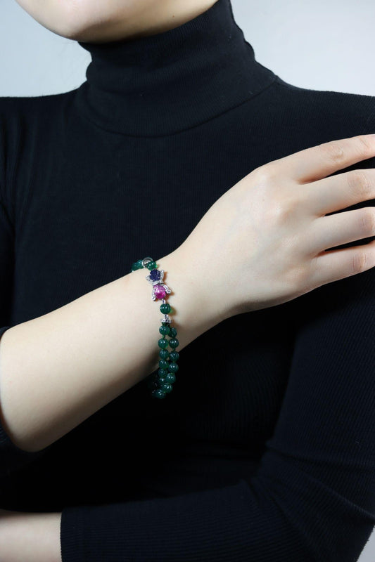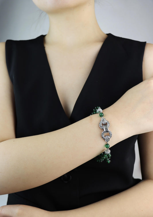 Art Deco Silver Tone Rhinestone Muti-Stand Green Beads Bracelet
