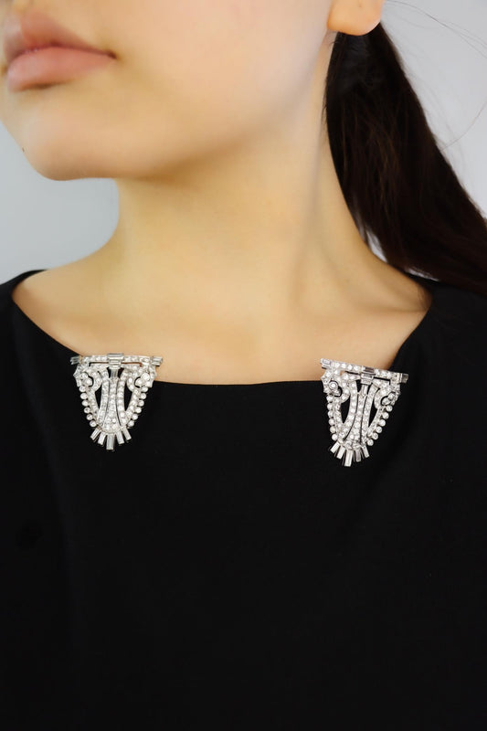 Vintage Art Deco Style Platinum Diamond Double Brooch Clips