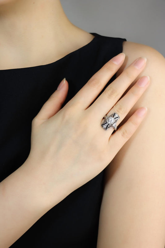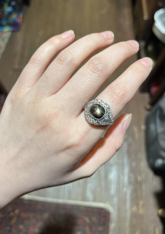 Art Deco Style Black Star Sapphire Diamond Platinum & 10K Ring