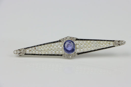 Art Deco Platinum Pearl & Ceylon Unheated Sapphire Brooch Pin AGL Certified