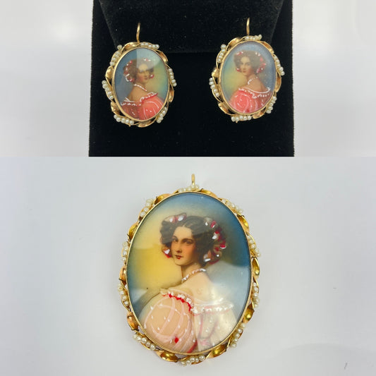 Antique 14k Gold Seed Pearl Painted Earring Brooch Set