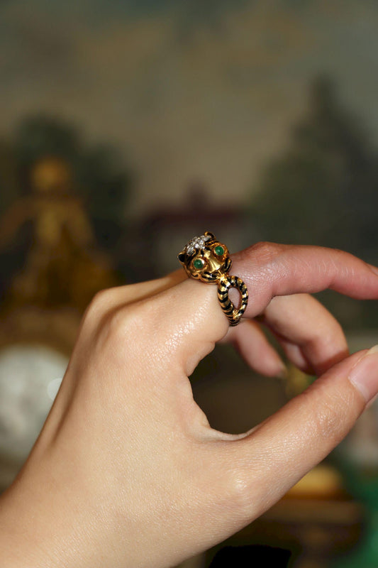 Vintage David Webb 18K Gold & Platinum Diamonds Emerald Tiger Ring