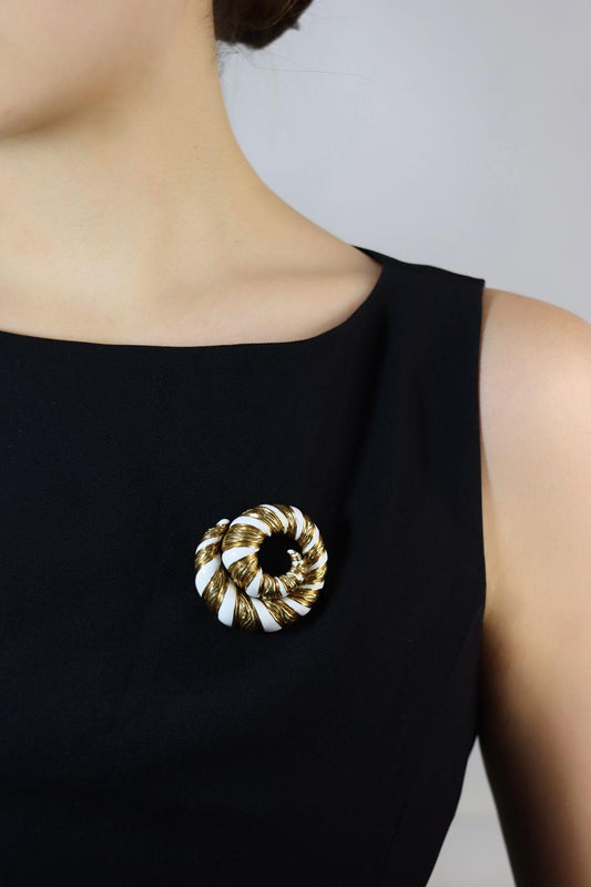 Vintage David Webb 18K Gold White Enamel Swirl Brooch
