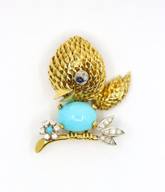 Vintage Van Cleef & Arpels 18K Gold Turquoise Diamond Robin Brooch Pin
