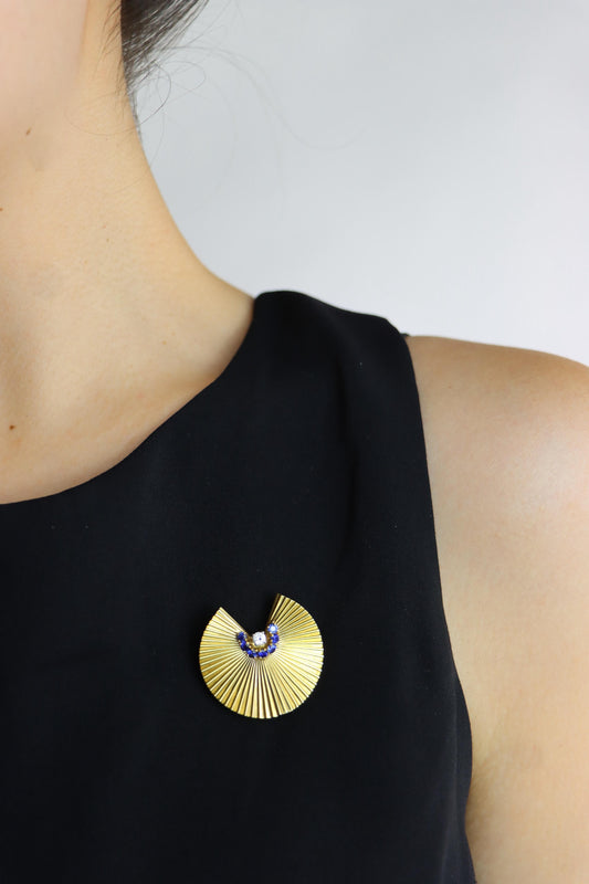 Cartier Retro 18K Gold Sapphire Diamond Brooch