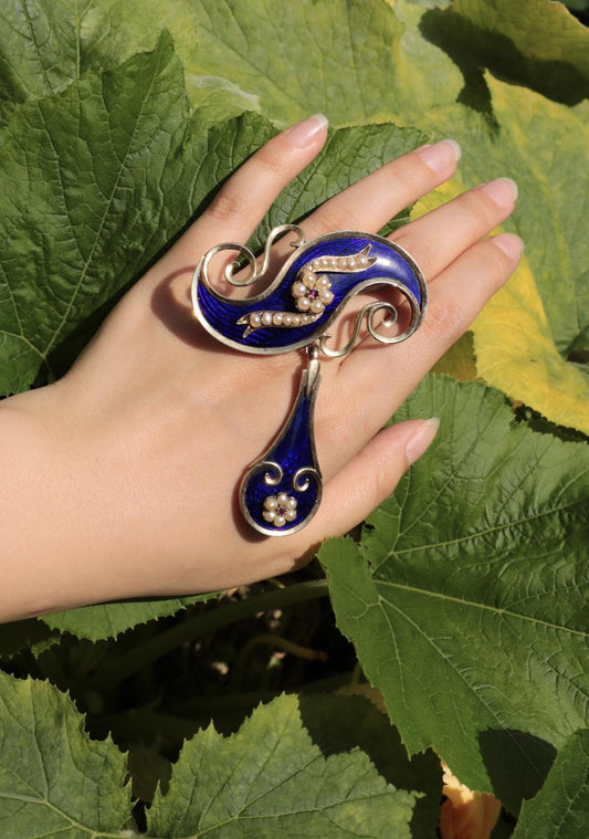 Victorian 14K Gold Cobalt Enamel Pearl Brooch Pin