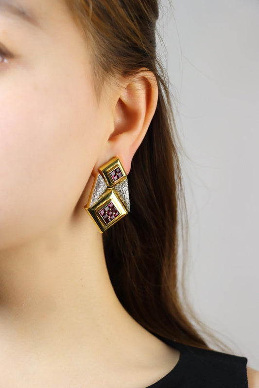 Vintage 18K Gold Diamonds Ruby Geometry Shape Earring