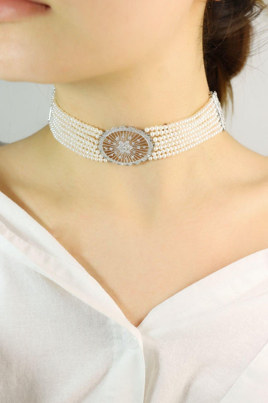 Vintage 18K White Gold Diamonds Muti-Strand Pearl Transformable Bracelet Choker