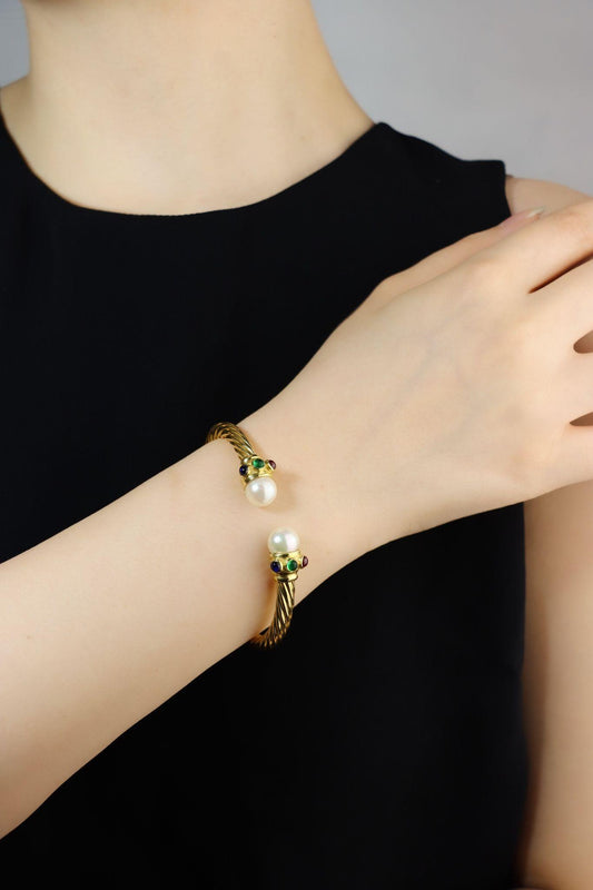 Vintage 18K Gold Pearl Ruby Sapphire Emerald Cuff Bracelet