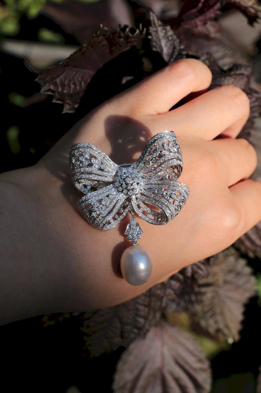 Vintage 18K White Gold Diamond Pearl Bow Tie Brooch Pin