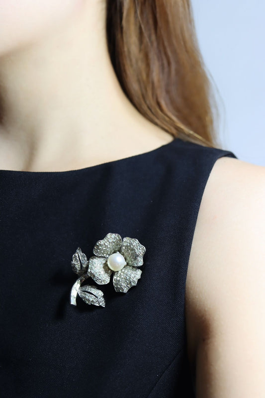 Vintage Jomaz Silver Tone Rhinestone Faux Pearl Brooch