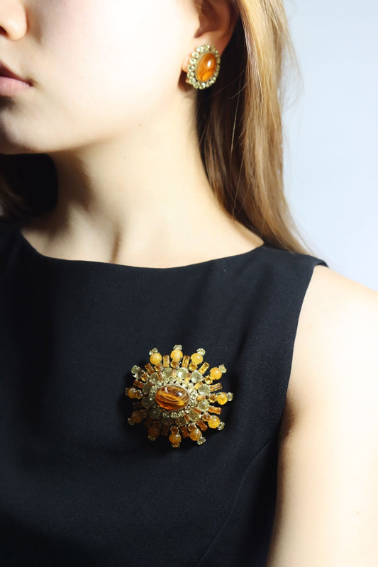 Vintage Schreiner Gold Tone Brown & Yellow Rhinestone Earrings & Brooch Set