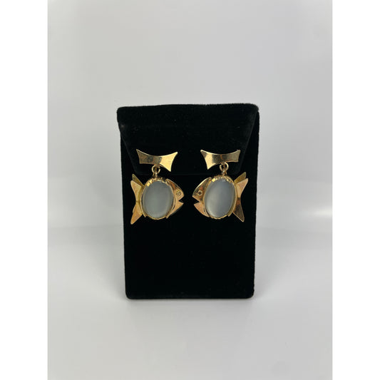 Pair of Vintage 14k Gold Moonstone Cabochon Fish Earrings