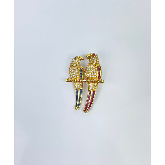 Vintage 18k Gold Diamond Ruby Sapphire Bird Brooch
