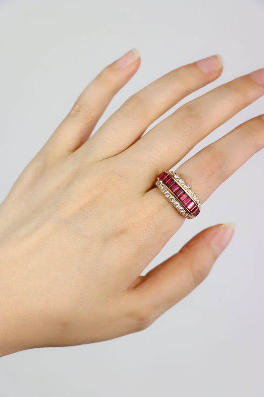 Retro 14K Tri-Tone Gold Diamond Ruby Buckle Ring