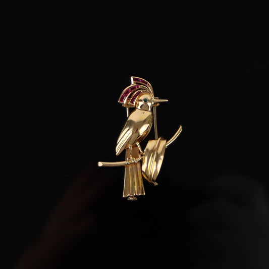 Vintage 18k Gold Enamel Ruby Rooster Brooch Pin