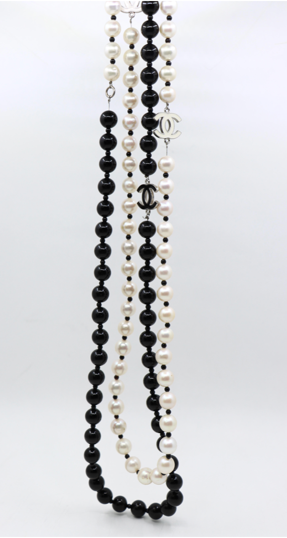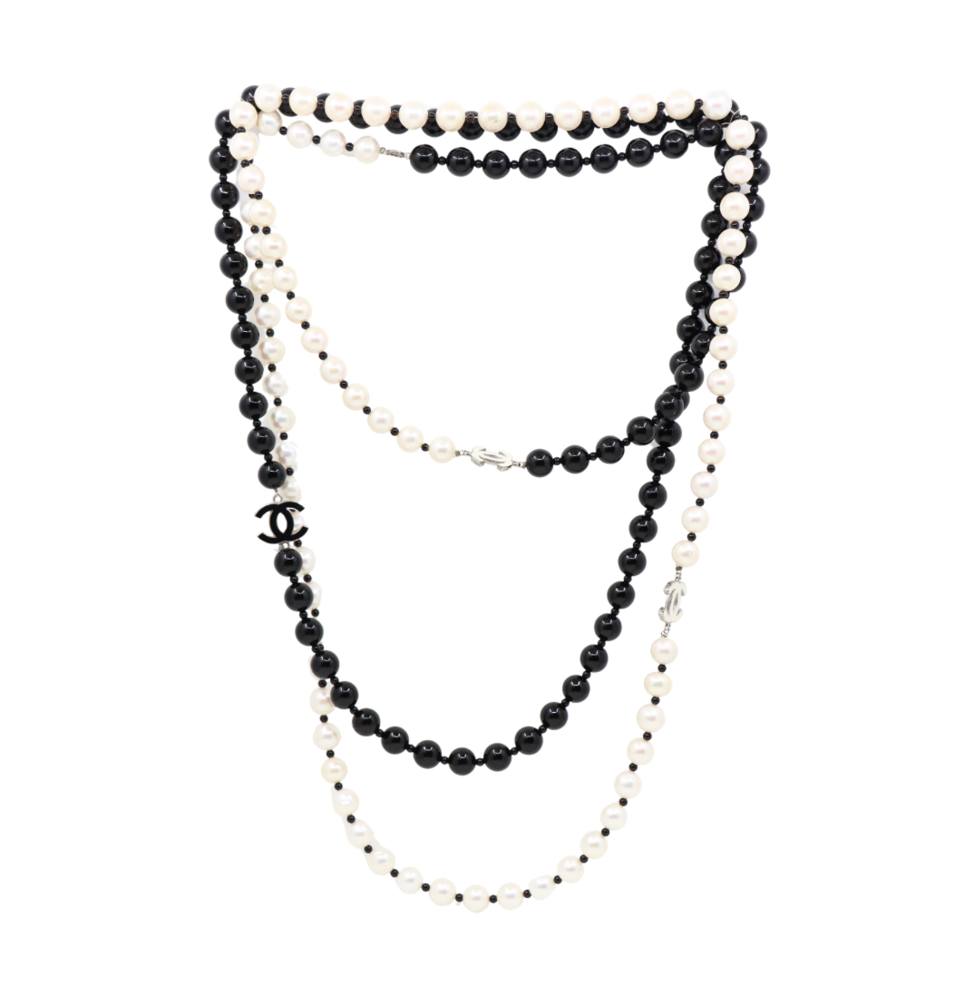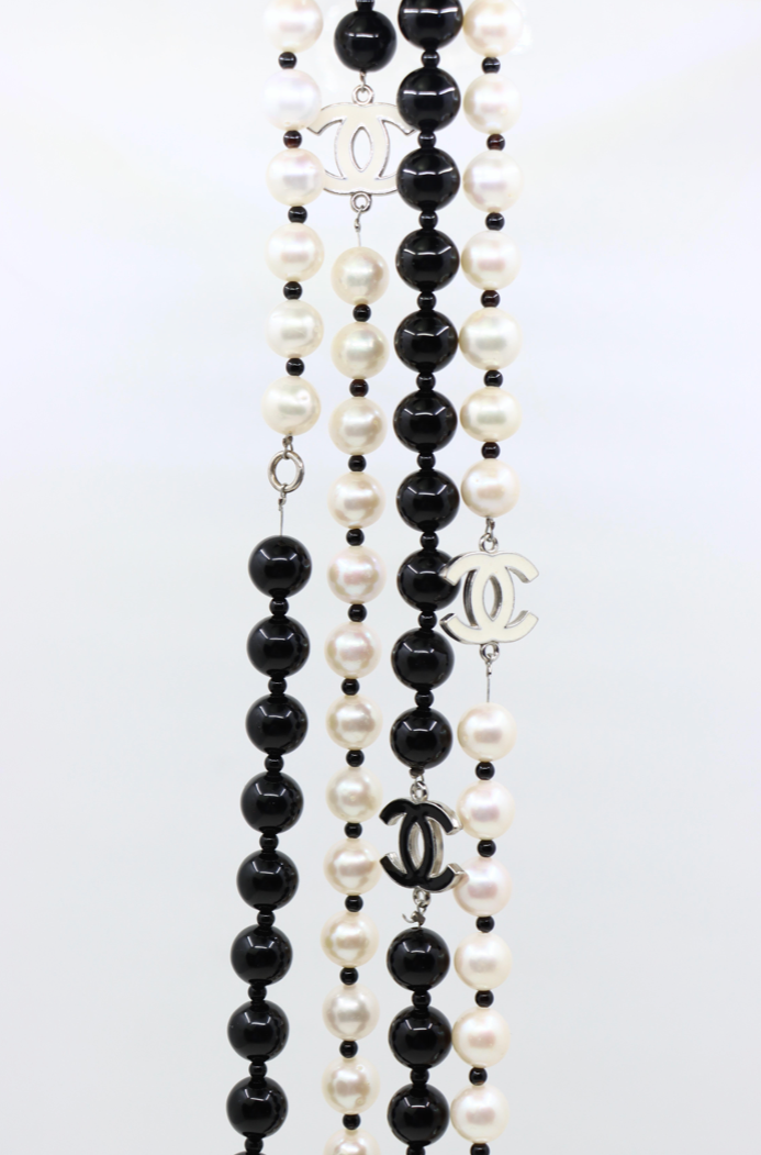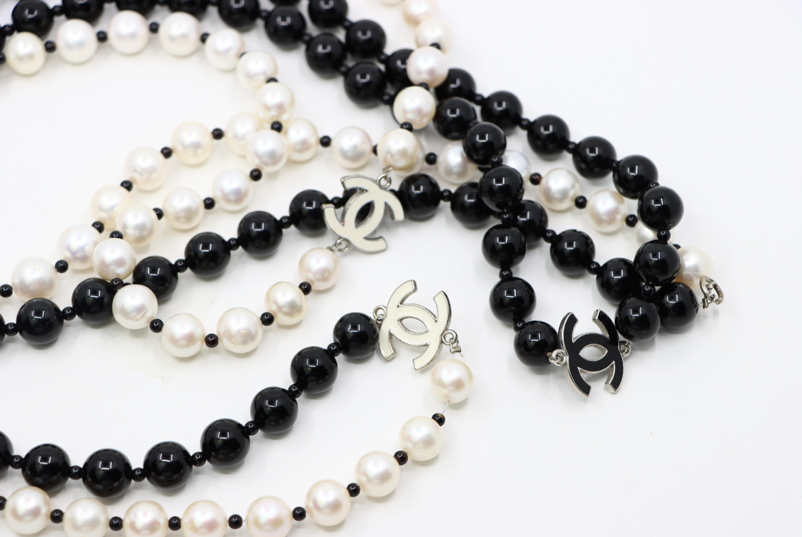 Chanel Black & White Faux Pearl Enamel Cc Logo Long Necklace