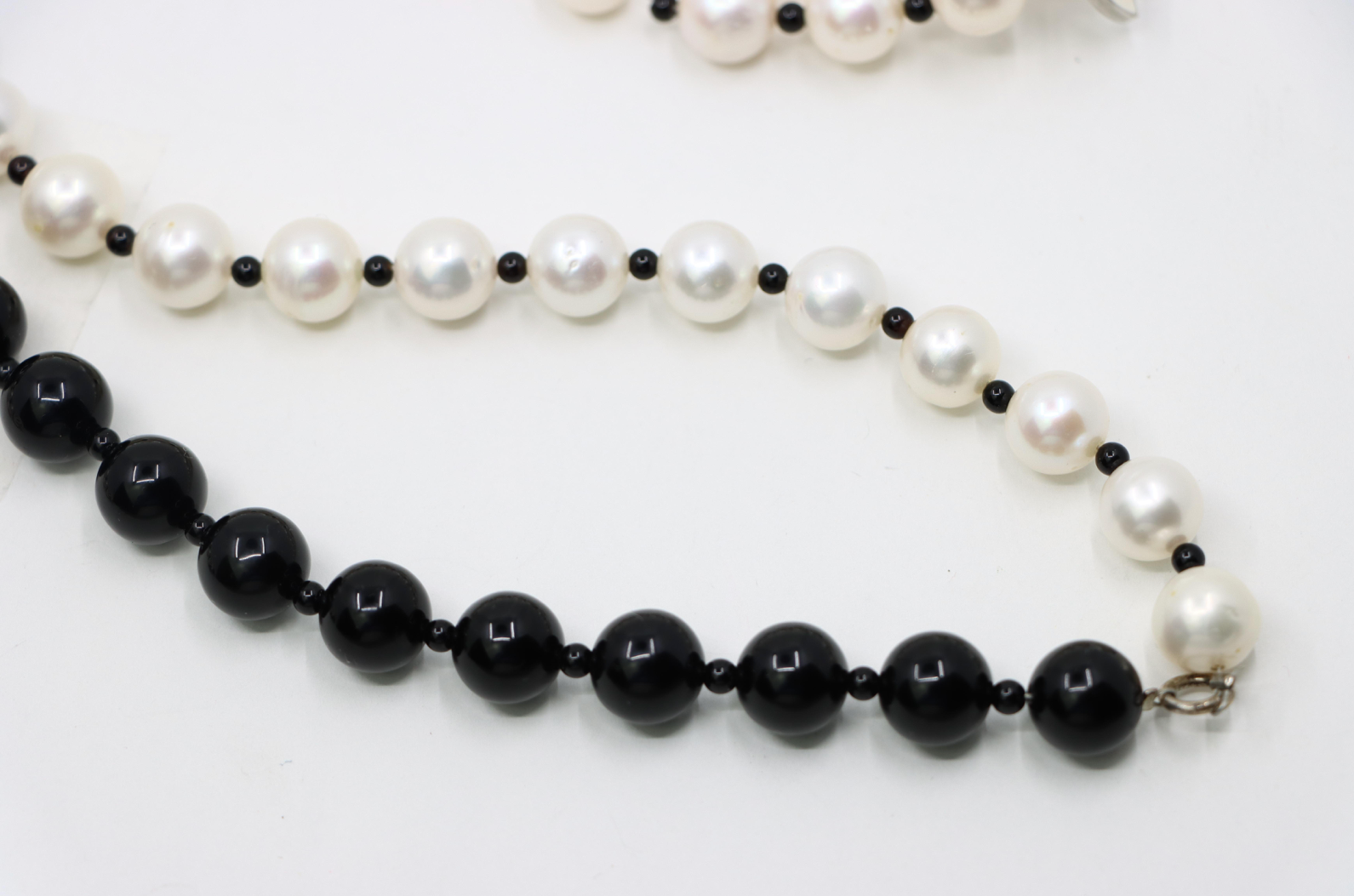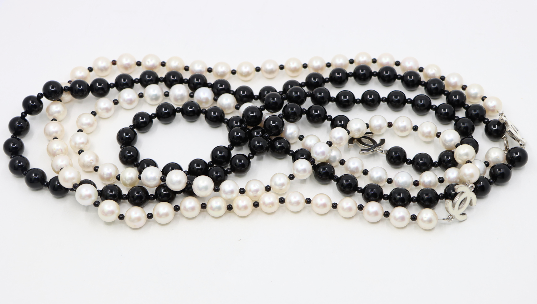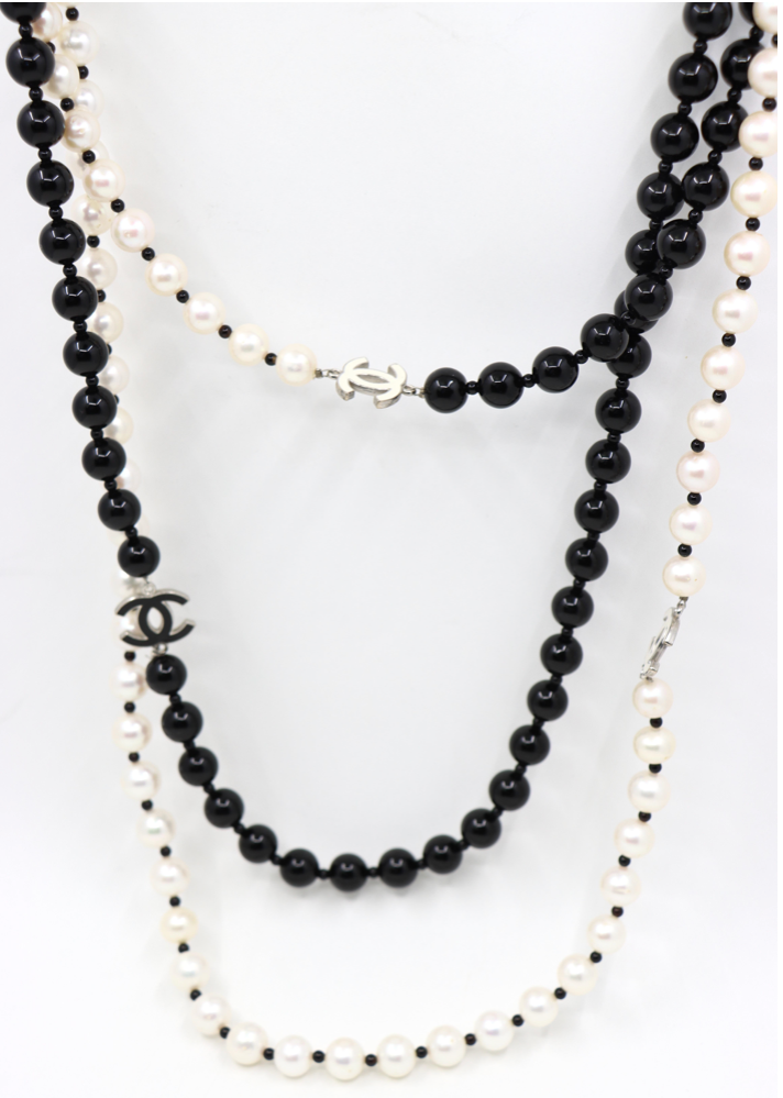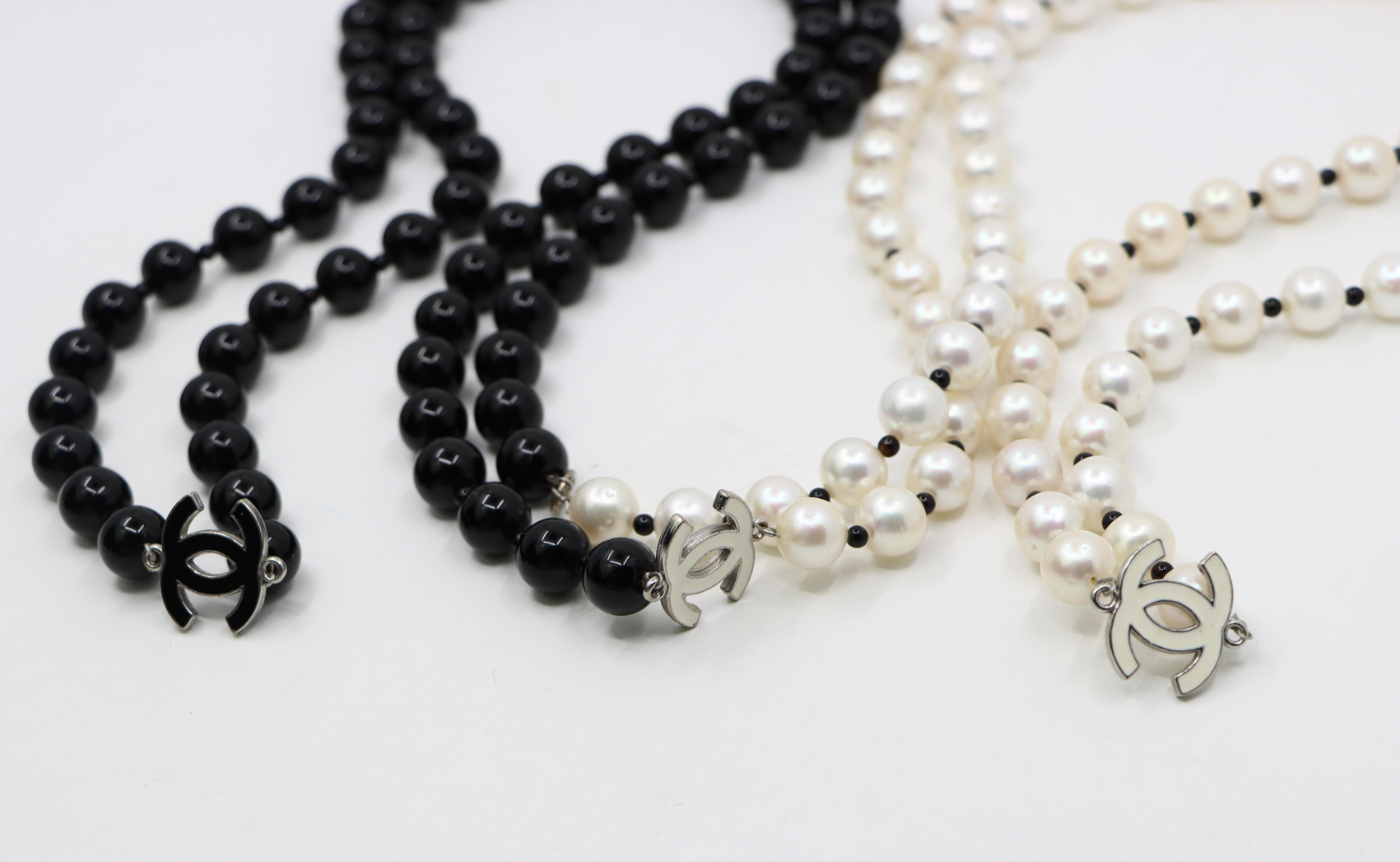 Chanel Black & White Faux Pearl Enamel Cc Logo Long Necklace